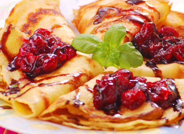 Naleśniki usmaż na oleju. Do czereśni w rondelku dodaj wino, ugotuj, mieszając. Dodaj sok z cytryny. Naleśniki posmaruj serkiem, ułóż na nim odłożone czereśnie i owoce z sosu. Złóż, polej sosem.